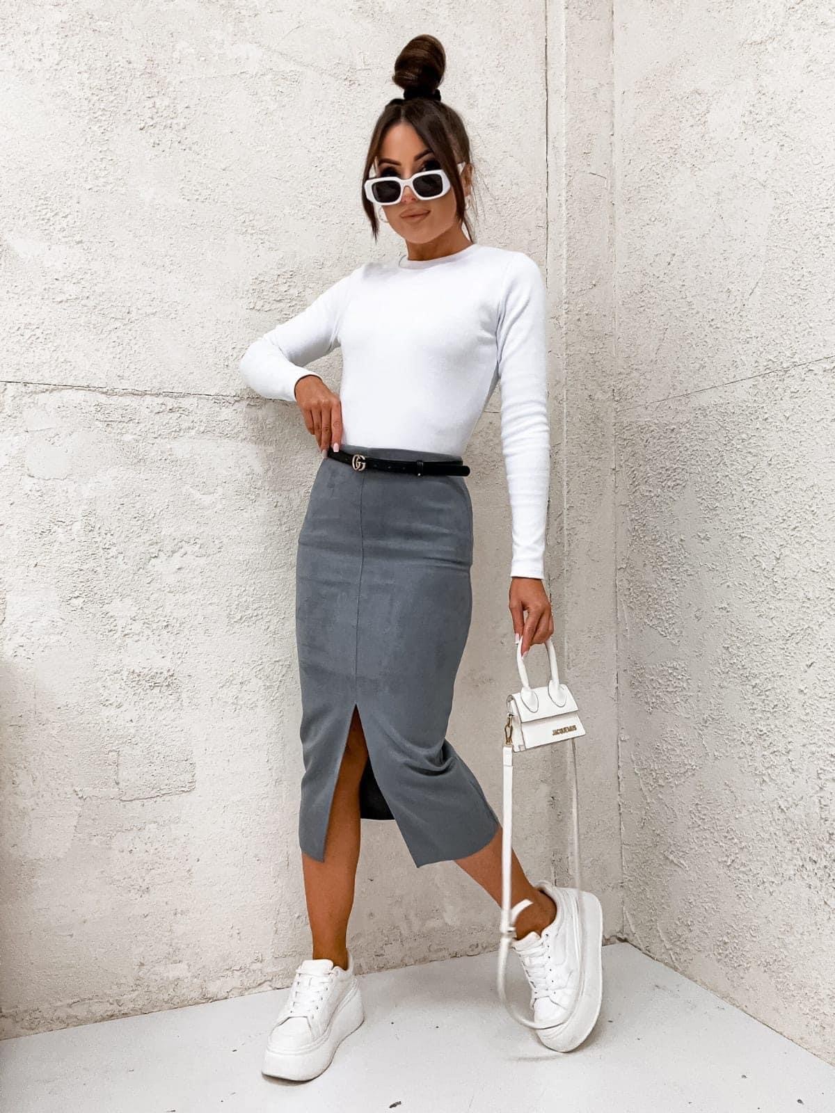 Spódnica ołówkowa w kolorze szarym wykonana z przyjemnego zamszu,