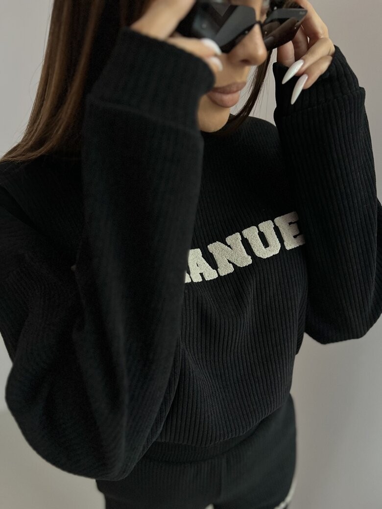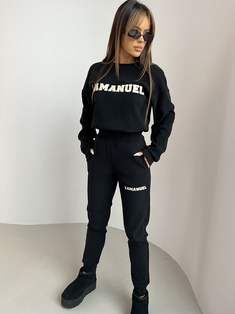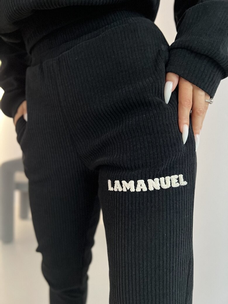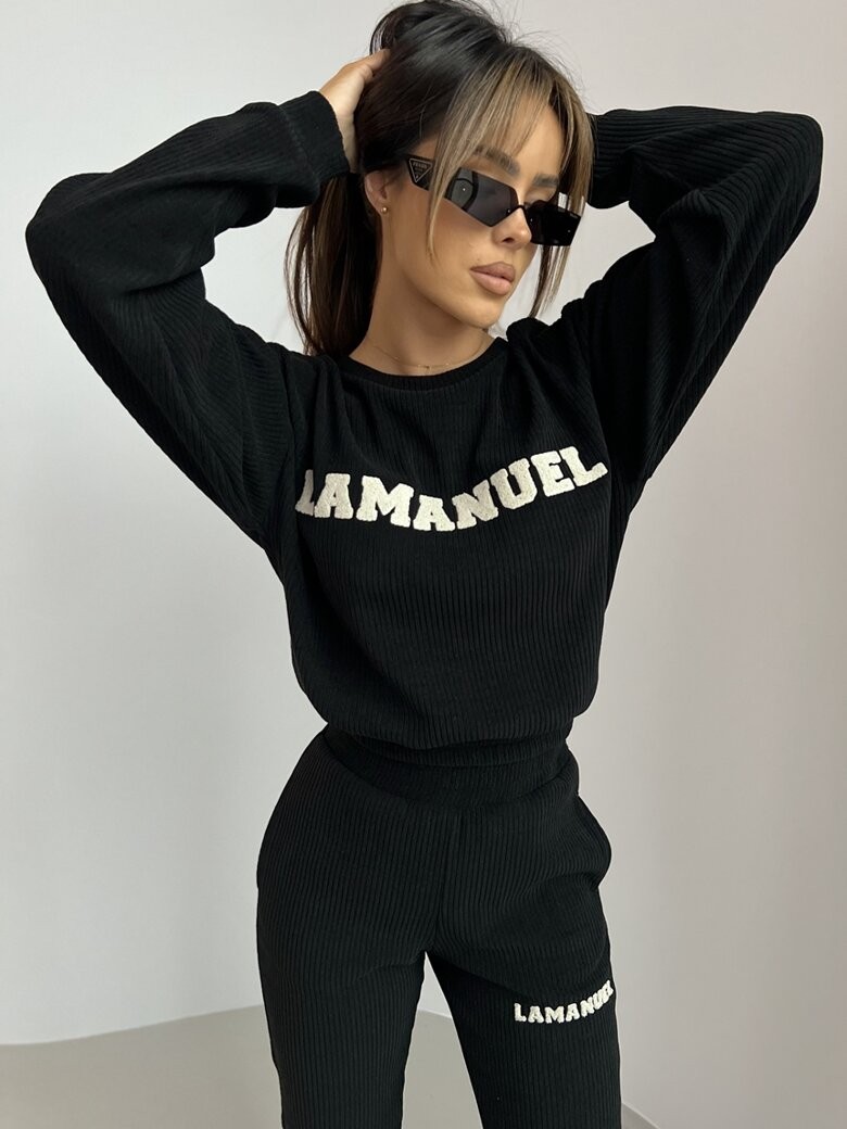 Nasz nowy model dresu idealnego na jesień i zimę! Składa się z bluzy z dekoltem w łódkę, która jest odsłoną codziennego komfortu. Duże logo marki La Manuel na przodzie nadaje jej wyrazistego charakteru. Spodnie w komplecie, wyposażone w wygodną gumkę w pasie i praktyczne kieszenie, łączą w sobie wygodę i styl. Małe logo na nogawce dodaje subtelnego, designerskiego akcentu. Komplet z prążkowanego materiału misia to połączenie klasyki i nowoczesności, które doskonale odzwierciedla Twoją wyjątkową osobowość. Niezależnie od okazji, ten zestaw zapewni Ci pewność siebie i komfort, pozwalając wyrazić swój niepowtarzalny styl.