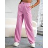 Wysoki stan, luźniejszy krój z szerokimi nogawkami i kieszeniami. Zapięcie regulowane za pomocą guzika. Marszczenie materiału.