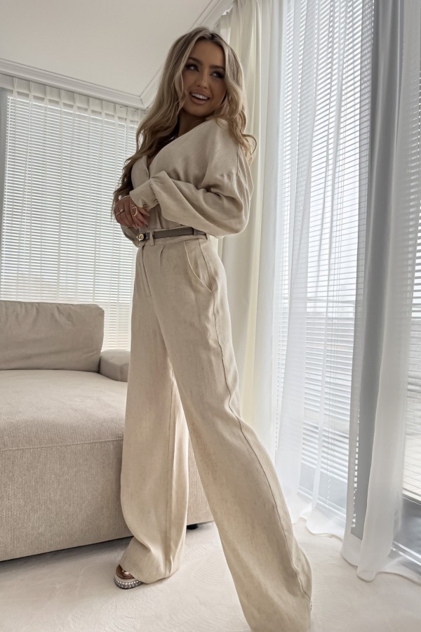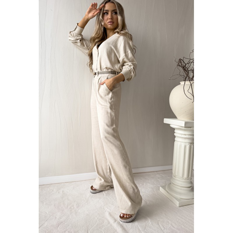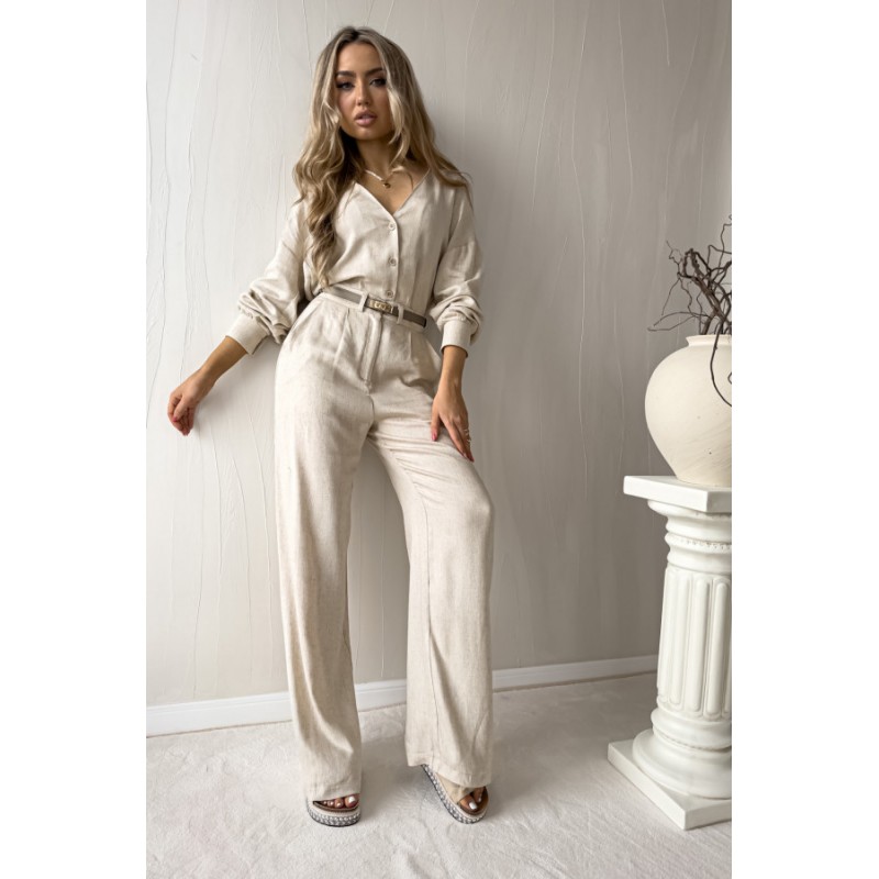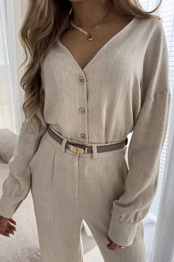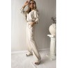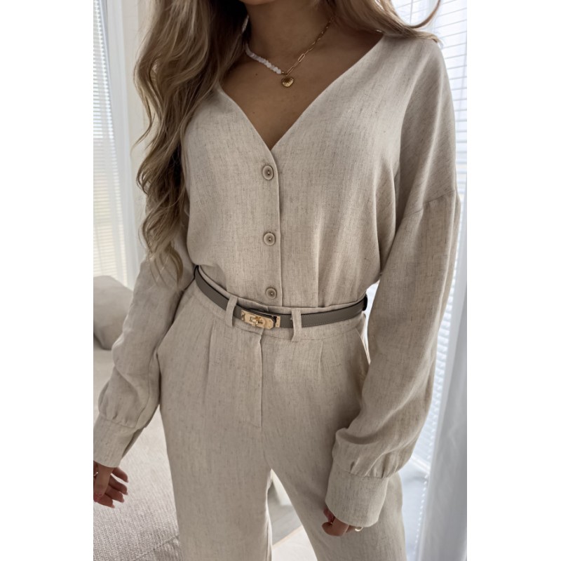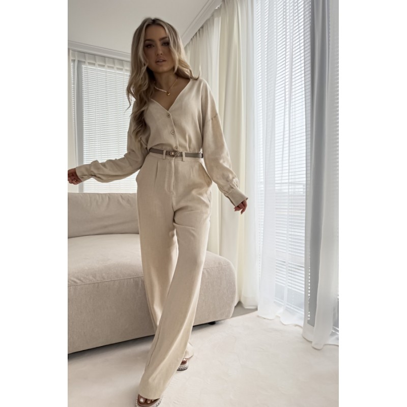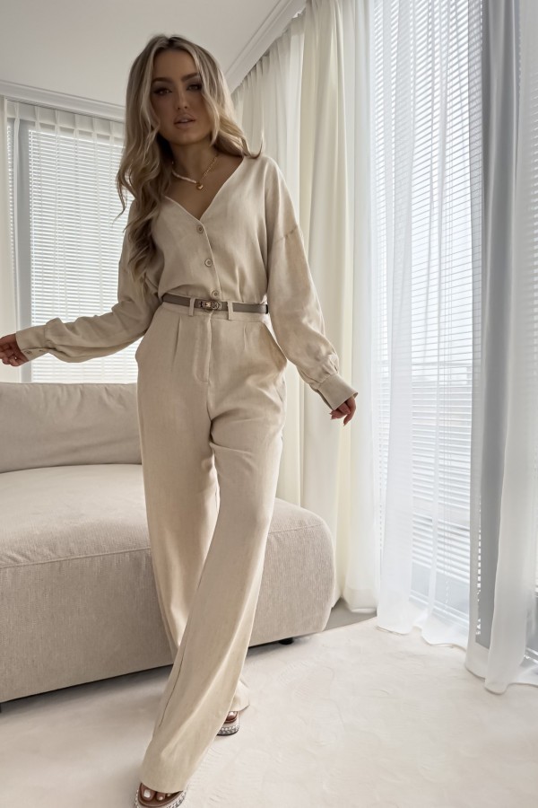 Komplet Mykonos składający się z koszuli i spodni. Koszula zapinana na kokosowe guziki, posiada dłuższy tył. Dekolt w serek. Spodnie posiadają szlufki, zapinane na suwak i guzik. Zestaw można wykorzystać również osobno- koszula świetnie sprawdzi się w zestawieniu z jeansami lub szortami, a spodnie będą pasowały do topów.