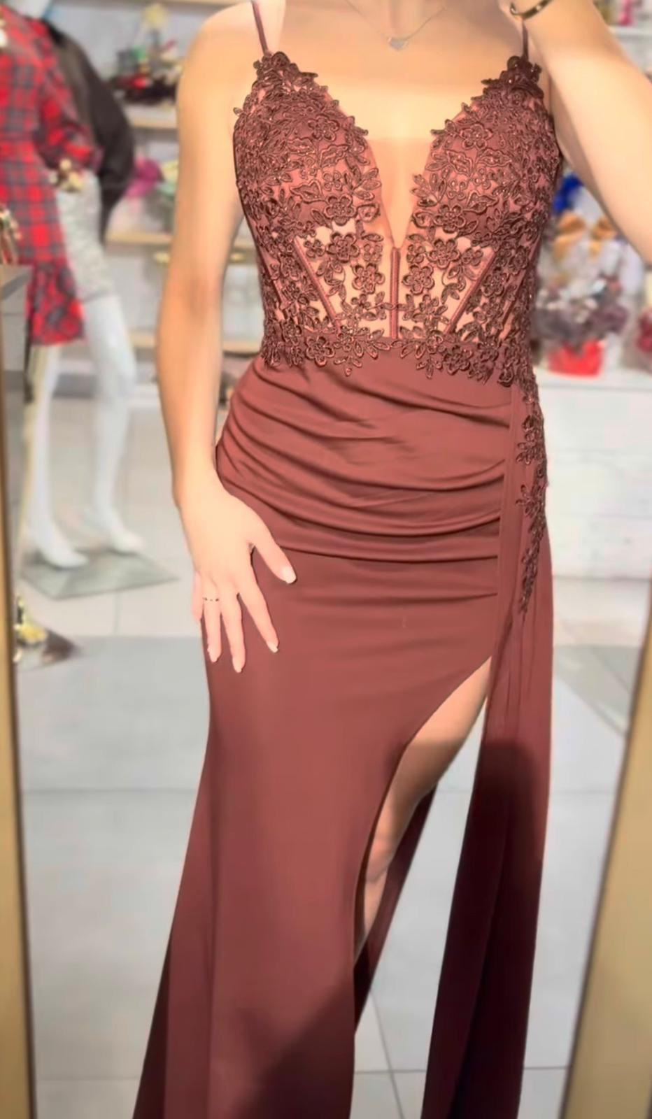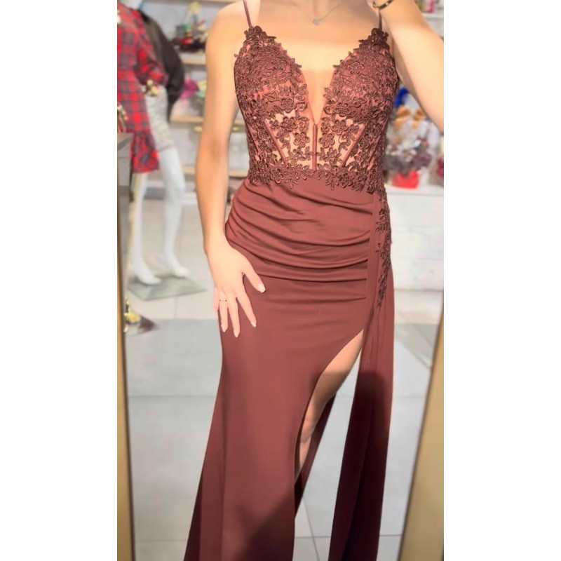 sukienka zapinana na zamek, posiada rozcięcie na nodze oraz wszyte miseczki