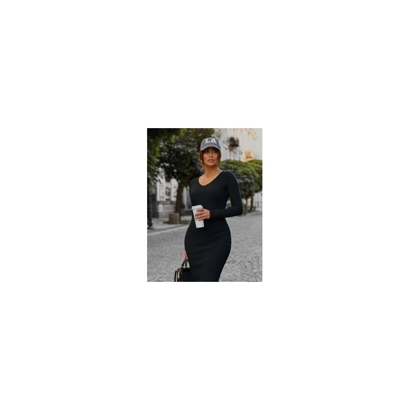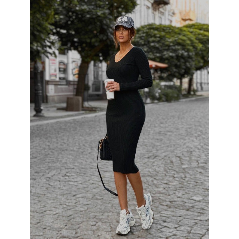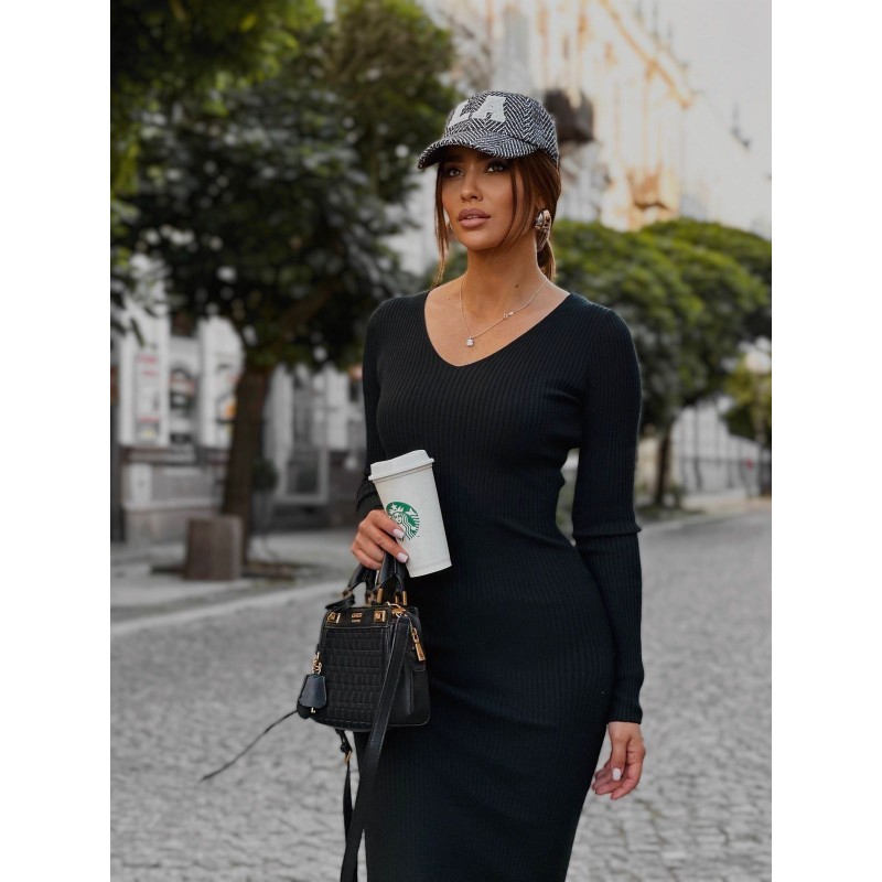 Sukienka czarna wykonana jest z prążkowanej, elastycznej tkaniny, która umiejętnie dopasuje się do Twojej sylwetki i wyeksponuje jej atuty. Posiada subtelny dekolt V oraz długość idealną dla miłośniczek midi. Występuje również w kolorze beżowym.