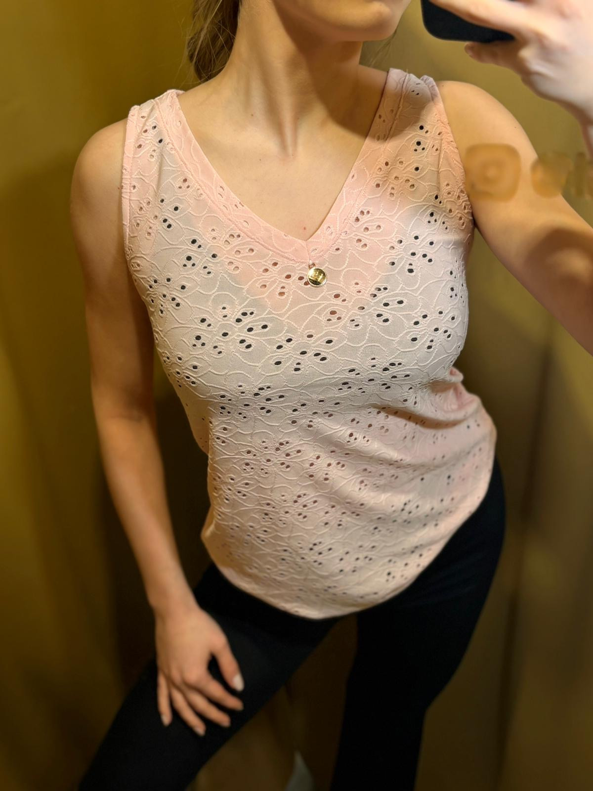 Delikatny top bez rękawów z zawieszką na środku dekoltu