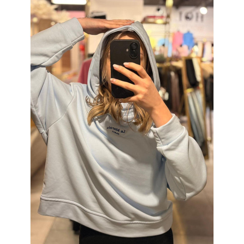 w odcieniu błękitu. Posiada również delikatny wyszyty napis z przodu.