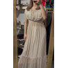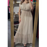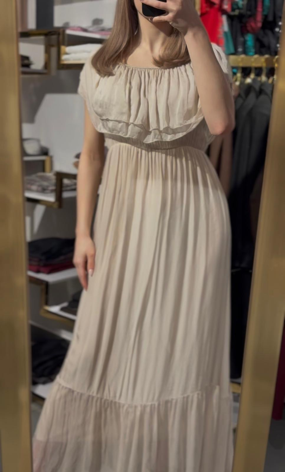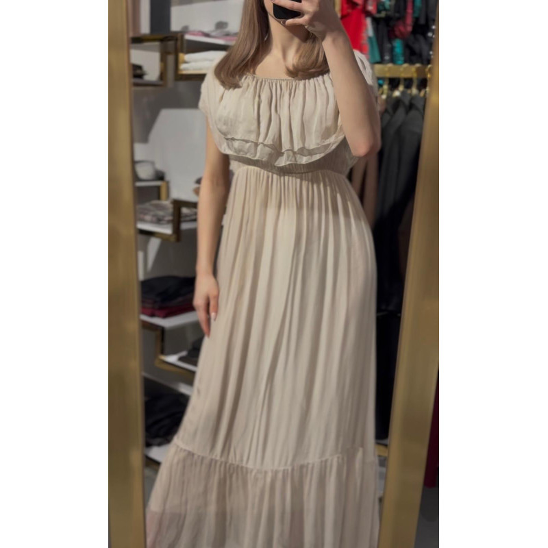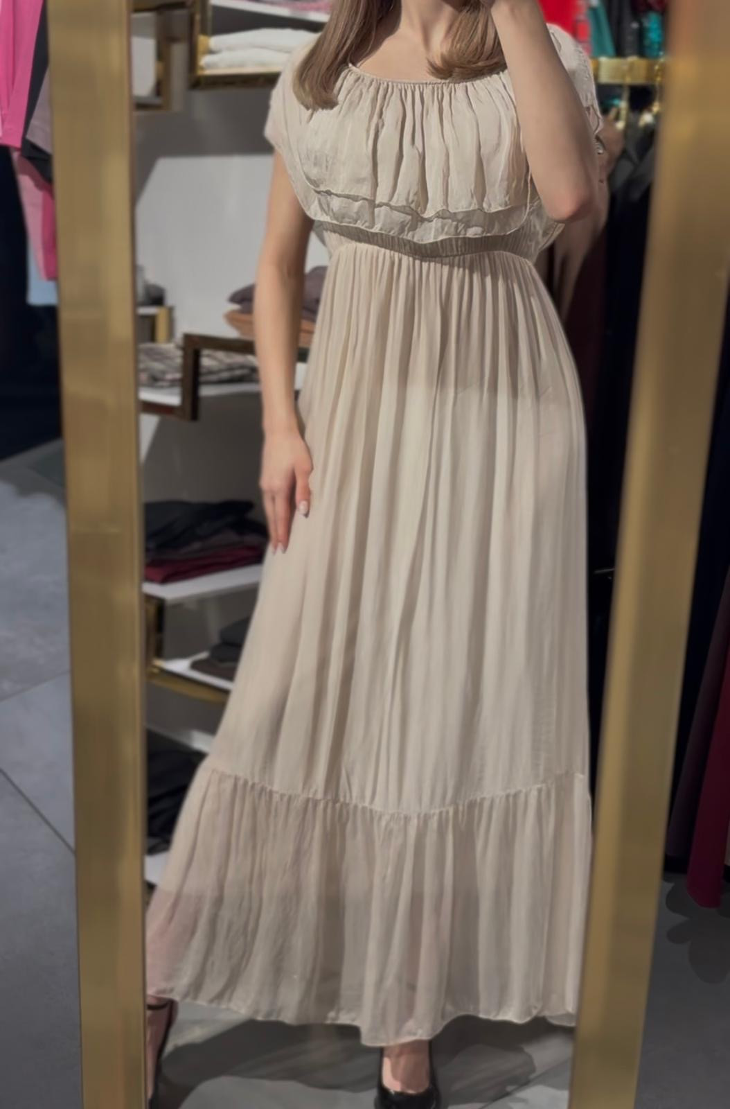 Długa sukienka w kolorze jasnego beżu z ozdobnymi falbankami