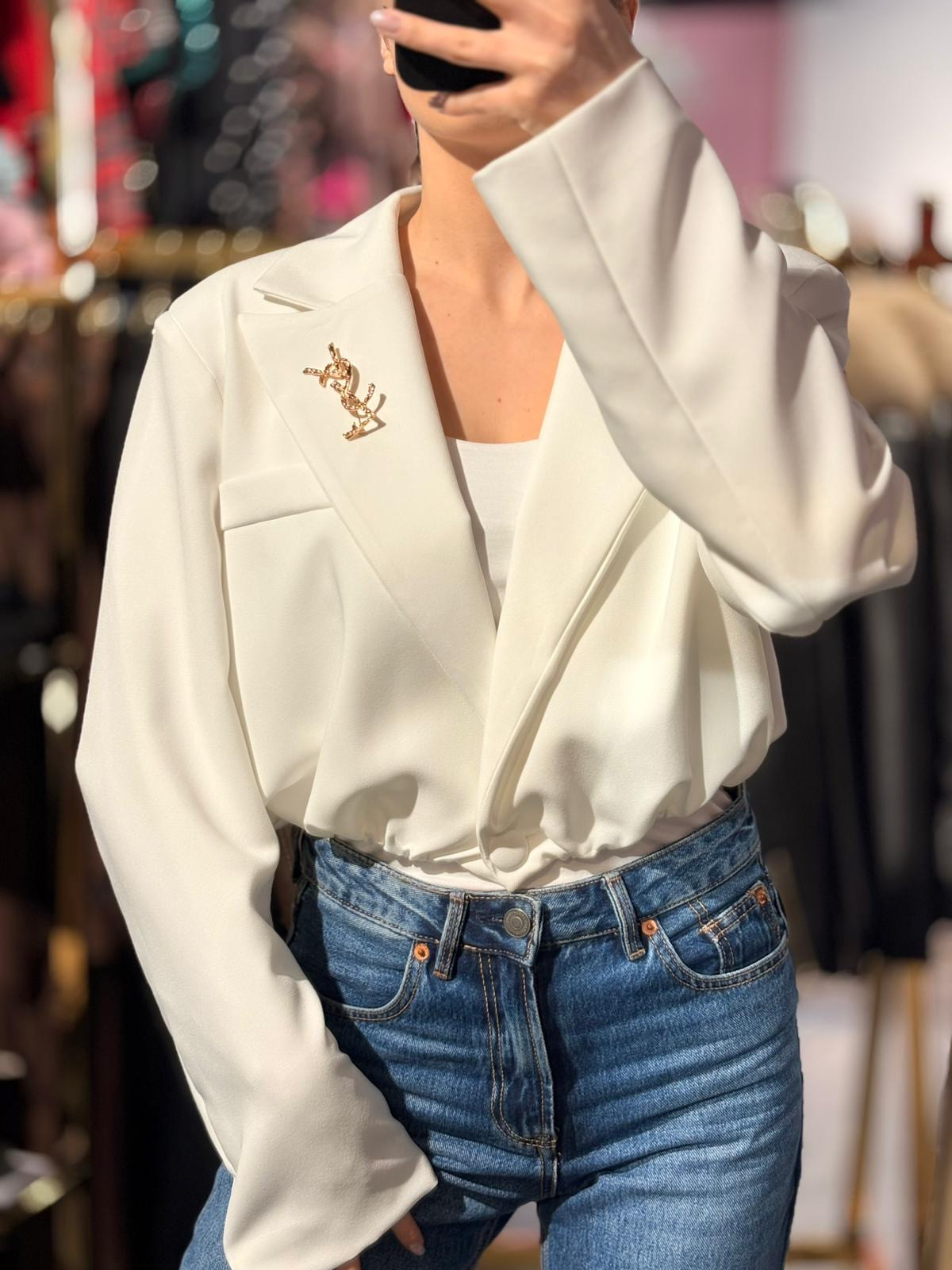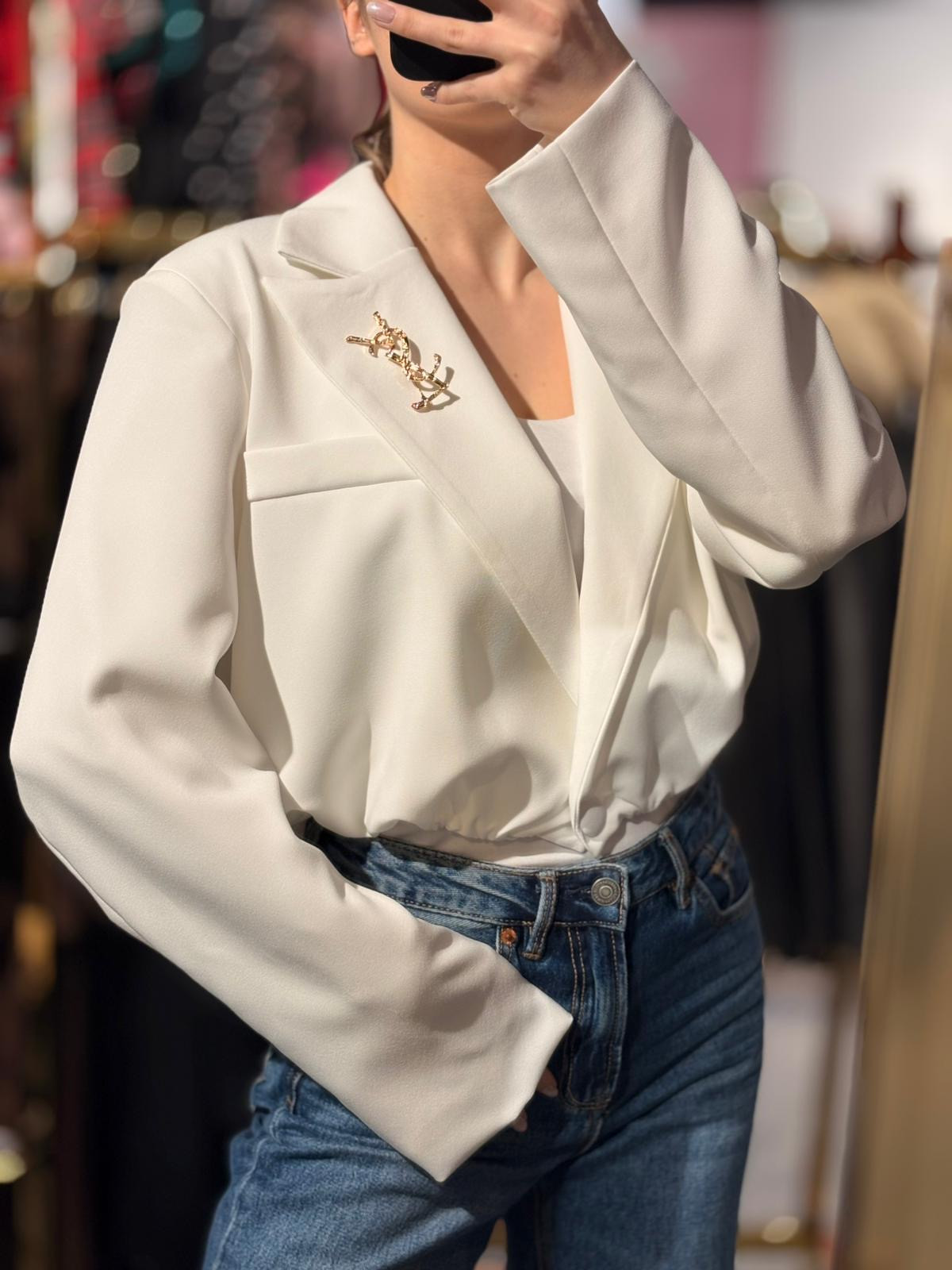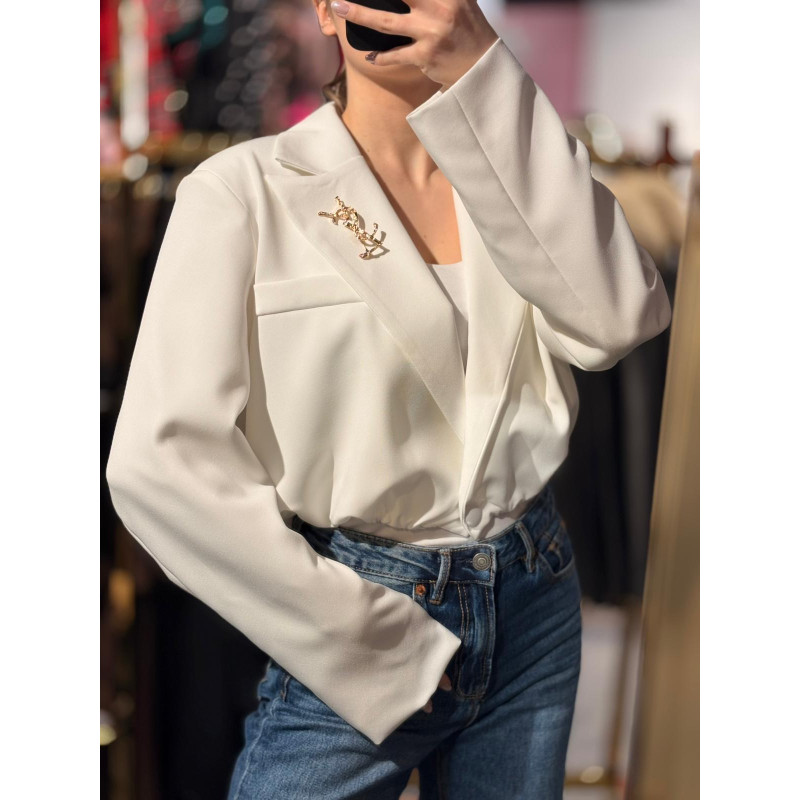 Krótka marynarka z ozdobna spinką którą można odpinać,