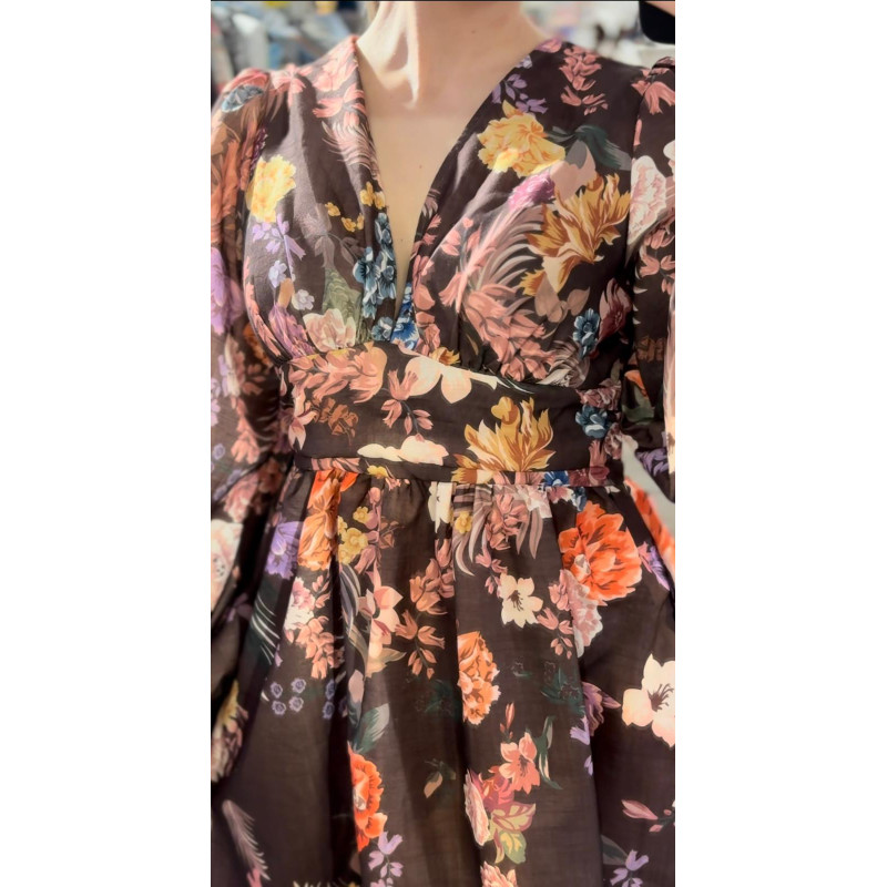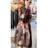 oraz kwiatami. Posiada głęboki dekolt.