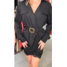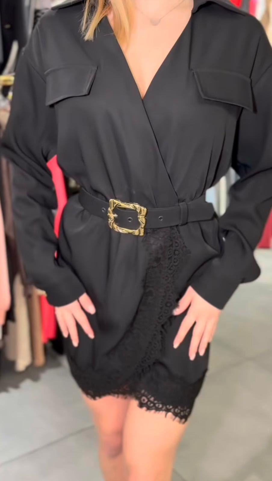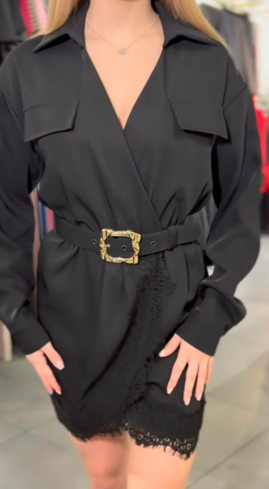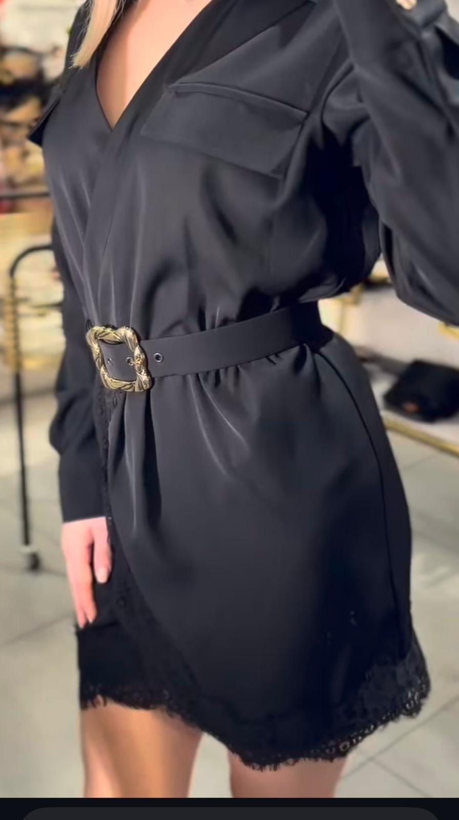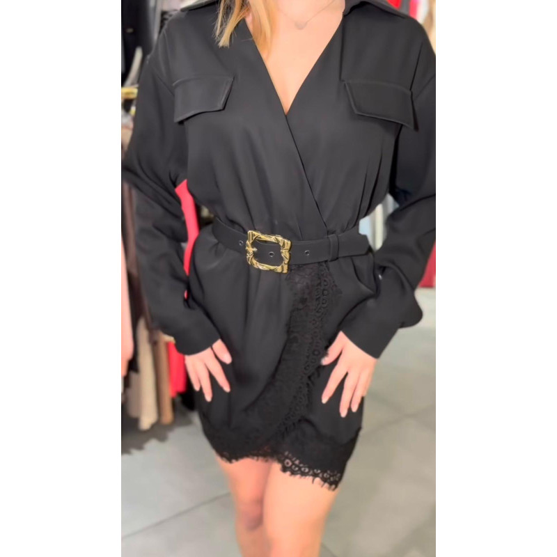 Elegancka czarna sukienka z elementami koronki oraz paskiem w tali